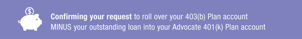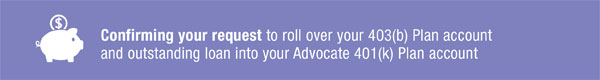 You have selected to roll over your account balance in the Advocate Health Care 403(b) Plan, including your outstanding loan into your Advocate 401(k) Plan account. To proceed with this direct roll over into your 401(k) Plan account, please click the "I confirm I am requesting a direct rollover of my 403(b) Plan account and outstanding loan to my 401(k) Plan account" button below.